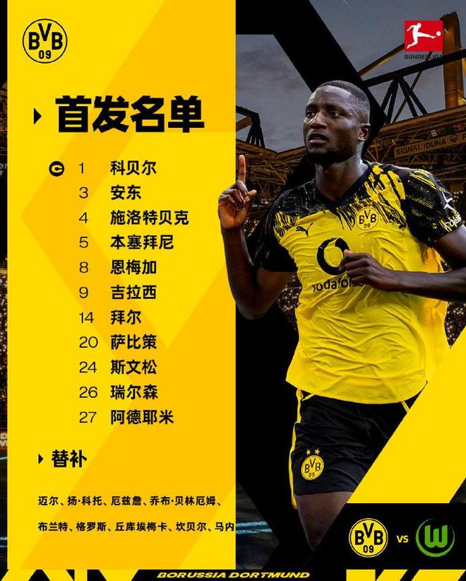 多特vs沃尔夫斯堡:吉拉西、阿德耶米首发,恩梅加、拜尔出战