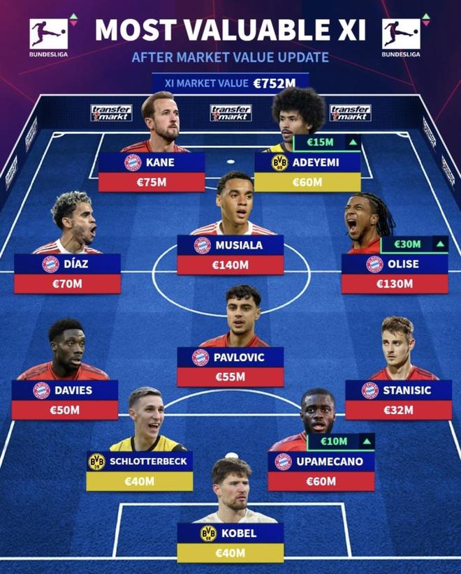 德国转会市场盘点了最新身价更新后的德甲最贵阵容。拜仁与多特“包围式”入选,穆西亚拉、奥利塞、凯恩等领衔锋线与边路,话题度瞬间拉满——这套身价十一人,你认可吗?数据截至:2025年10月15日。具体阵容前锋凯恩(Harry Kane)国籍:英格兰俱乐部:拜仁慕尼黑年龄:32球员身价:7500万欧元球员涨幅变化:—阿德耶米(Karim Adeyemi)国籍:德国俱乐部:多特蒙德年龄:23球员身价:6000万欧元球员涨幅变化:+1500万欧元中场迪亚斯(Luis Díaz)国籍:哥伦比亚俱乐部:拜仁慕尼黑年龄:28球员身价:7000万欧元球员涨幅变化:—穆西亚拉(Jamal Musiala)国籍:德国俱乐部:拜仁慕尼黑年龄:22球员身价:1.40亿欧元球员涨幅变化:—奥利塞(Michael Olise)国籍:法国俱乐部:拜仁慕尼黑年龄:23球员身价:1.30亿欧元球员涨幅变化:+3000万欧元帕夫洛维奇(Aleksandar Pavlović)国籍:德国俱乐部:拜仁慕尼黑年龄:21球员身价:5500万欧元球员涨幅变化:—后卫戴维斯(Alphonso Davies)国籍:加拿大俱乐部:拜仁慕尼黑年龄:24球员身价:5000万欧元球员涨幅变化:—施洛特贝克(Nico Schlotterbeck)国籍:德国俱乐部:多特蒙德年龄:25球员身价:4000万欧元球员涨幅变化:—于帕梅卡诺(Dayot Upamecano)国籍:法国俱乐部:拜仁慕尼黑年龄:26球员身价:6000万欧元球员涨幅变化:+1000万欧元斯塔尼西奇(Josip Stanišić)国籍:克罗地亚俱乐部:拜仁慕尼黑年龄:25球员身价:3200万欧元球员涨幅变化:—门将科贝尔(Gregor Kobel)国籍:瑞士俱乐部:多特蒙德年龄:27球员身价:4000万欧元球员涨幅变化:—阵容实力分析这套“德甲最贵XI”进攻火力很足。凯恩背身拿球、做球和门前把握都稳;穆西亚拉能带能传,关键时刻能破局;奥利塞和迪亚斯/阿德耶米速度快、单挑强,反击范围大,定位球也有戏。弱点是遇到密集防守时,容易在两边来回倒,禁区前直塞和跟进射门不够,缺一个敢前插、能多点开花的中场来分担。后场走“速度+硬度”的路子。戴维斯回防快,乌帕身体强但偶尔会冒进;施洛特贝克出球好,转身慢些,需要队友照应;斯塔尼西奇稳。帕夫洛维奇沉稳,但年轻,被对手逼得紧时还需磨炼。科贝尔门前可靠。整体能打硬仗,也能加快节奏,但平衡感稍差;若再补一名跑动积极、上下能插的中场,整体上限更高。综合评分:8.5/10