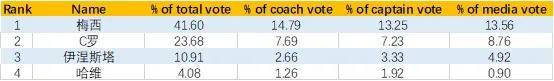 2014年的金球奖C罗获得了303张选票的第一选票,排名第二的梅西获得55张选票,紧随其后的诺伊尔85张。由此不难看出该赛季里C罗的领先优势是不可阻挡和质疑的,个人能力的碾压式上升达到了顶峰。