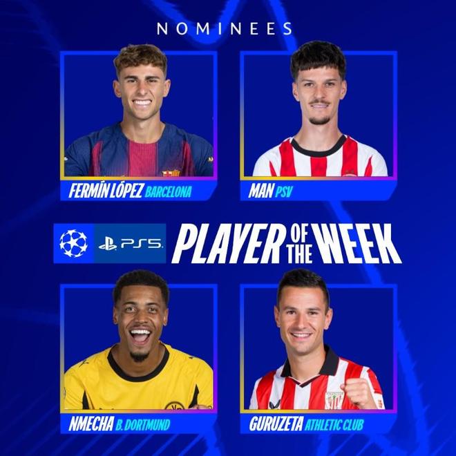 欧冠本轮最佳球员候选费尔明 上演帽子戏法助巴塞罗那主场6-1大胜奥林匹亚科斯丹尼斯-曼 上演梅开二度助埃因霍温主场6-2大胜那不勒斯恩梅加 上演梅开二度助多特蒙德客场4-2击败哥本哈根古鲁泽塔 上演梅开二度助毕尔巴鄂竞技主场3-1战胜卡拉巴赫