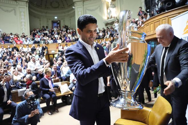 谈及最重要的人当提及2019年逝世的母亲时,他灿烂的笑容化为真挚动容——这位“最重要的人”是他在赢得梦寐以求的欧冠冠军后最先想到的。哽咽声中断了发言,纳赛尔不得不停下喝了几口水。纳赛尔说道:“卡塔尔有时差,她总是熬夜到凌晨两点看我们的比赛。”谈及俱乐部的口号纳赛尔说道:“我们曾选择‘敢于梦想’作为口号,但后来撤下了它,因为我坚信我们终将赢得欧冠。何时夺冠?我当时并不确定。但要相信自己的目标,别让任何人动摇你。赢得这座奖杯异常艰难。不要安于渺小的梦想,要敢于胸怀大志。同时要专注于细节,这正是决定成败的关键。”“如果可以回到过去,你会改变什么?”纳赛尔表示:“有人曾问我:如果可以回到过去,你会改变什么?我认为每位效力过巴黎的球员都为赢得这座奖杯做出了贡献。你提到的那些球星——内马尔、梅西、姆巴佩、伊布、卡瓦尼,他们每个人都帮助塑造了俱乐部。必须永远善待那些曾为你付出的人。俱乐部的方法论和哲学源于集体,源于为彼此而战的精神。这就是我们打造的精神特质——为他人奉献。我们拥有世界最佳教练和最出色的球迷。”谈及卡塔尔体育投资公司2011年收购巴黎圣日耳曼后的发展历程纳赛尔说道:“我们曾有很多投资选择。选择巴黎是因为我们热爱法国,这是世界上最美丽的城市。我们以7000万欧元收购俱乐部,持续投资并建设训练中心。一年半前,俱乐部估值(不含球场)已达50亿欧元,如今无疑更高。我们引入了战略投资者,并组建了顶尖管理团队。”对索邦大学经济学院学生的鼓励纳赛尔表示:“去做你想做的事。担任巴黎圣日耳曼主席,这不是一份工作,而是一种激情。我的梦想,是看到你们未来可以领导这家俱乐部。相信自己的目标,加入我们巴黎圣日耳曼。”
