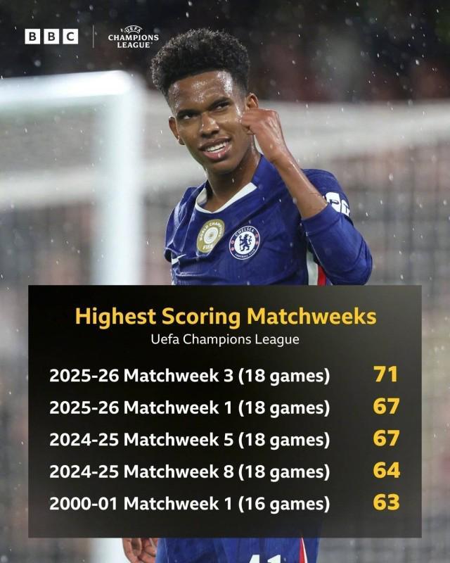 欧冠上演疯狂进球夜,单轮狂轰71球创历史纪录