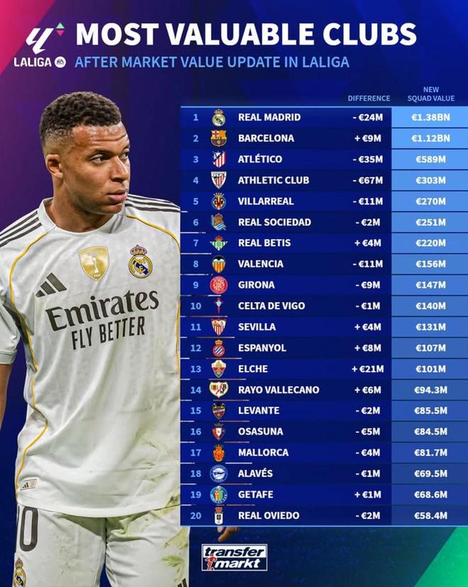 德转更新后西甲俱乐部身价排行榜:1. 皇家马德里 13.8亿欧元(-2400万欧元)2. 巴塞罗那 11.2亿欧元(+900万欧元)3. 马德里竞技 5.89亿欧元(-3500万欧元)4. 毕尔巴鄂竞技 3.03亿欧元(-6700万欧元)5. 比利亚雷亚尔 2.7亿欧元(-1100万欧元)6. 皇家社会 2.51亿欧元(-200万欧元)7. 皇家贝蒂斯 2.2亿欧元(+400万欧元)8. 瓦伦西亚 1.56亿欧元(-1100万欧元)9. 赫罗纳 1.47亿欧元(-900万欧元)10. 塞尔塔 1.4亿欧元(-100万欧元)11. 塞维利亚 1.31亿欧元(+400万欧元)12. 西班牙人 1.07亿欧元(+800万欧元)13. 埃尔切 1.01亿欧元(+2100万欧元)14. 巴列卡诺 9430万欧元(+600万欧元)15. 莱万特 8550万欧元(-200万欧元)16. 奥萨苏纳 8450万欧元(-500万欧元)17. 马略卡 8170万欧元(-400万欧元)18. 阿拉维斯 6950万欧元(-100万欧元)19. 赫塔费 6860万欧元(+100万欧元)20. 皇家奥维耶多 5840万欧元(-200万欧元)