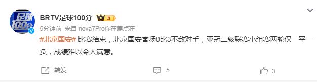 而北京媒体《足球100分》栏目,也直言不讳指出球队表现无法令人满意,“比赛结束,北京国安客场0比3不敌对手,亚冠二级联赛小组赛两轮仅一平一负,成绩难以令人满意。 ”