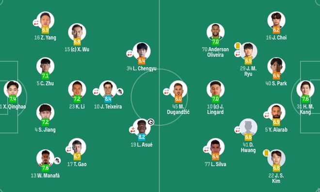【出场阵容】上海申花首发(4-2-3-1)门将:1-薛庆浩后卫:13-马纳法(F)、4-蒋圣龙、5-朱辰杰、16-杨泽翔(66'27-陈晋一(F))后腰:23-李可、15-吴曦前卫:17-高天意(66'7-徐皓阳)、10-特谢拉(F)(92'43-杨皓宇)、34-刘诚宇(46'9-安德烈-路易斯(F))前锋:19-阿苏埃(F)(69'11-绍洛-米内罗(F))替补未出场:30-鲍亚雄、2-王世龙、3-金顺凯、32-艾迪、6-阿马杜(F)、33-汪海健、45-韩嘉文首尔队首发(4-3-3)门将:31-姜贤茂后卫:40-朴声勋、5-亚赞·阿拉伯(F)(46'20-李韩道)、22-金珍洙、16-崔俊中场:10-杰西·林加德(F)、41-黄度允(87'7-郑承原)、29-柳在文(59'8-李胜模)前锋:70-安德森·奥利维拉(F)(46'27-文宣民)、77-卢卡斯·席尔瓦(F)、45-马尔科·杜甘季奇(F)(75'11-千成薰)替补未出场:21-崔喆元、、9-曹永旭、18-郑泰旭、33-裴炫瑞、36-金志源、63-朴秀日、88-朴张韩杰主裁:阿卜杜拉-贾迈利(科威特) VAR:阿卜杜拉-阿拉伯(科威特)
