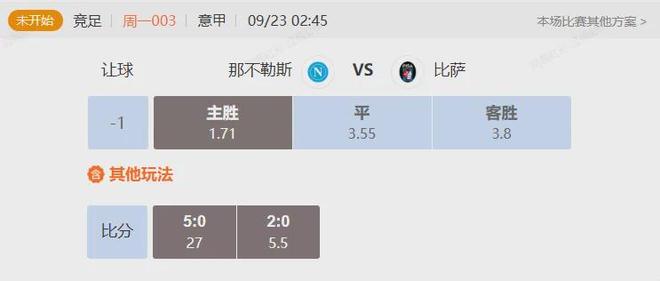 在周中欧冠输给曼城后,那不勒斯回到联赛对阵升班马比萨。在对阵曼城的比赛,那不勒斯上半场未过半就被罚下一人,球队换下了德布劳内补充一名后卫,这让德布劳内反而消耗不会太大,未必不是好事。那场比赛最终那不勒斯0比2失利,不过在联赛赛程,那不勒斯目前保持着全胜,击败了萨索罗、卡利亚里和佛罗伦萨,自 2 月份以来,那不勒斯跨赛季连续15场联赛中保持不败,在过去的 7 场主场赢了 6 场——只丢了 4 个球。本场比赛是比萨时隔35年后再次在意甲赛场与那不勒斯交手,升班马比萨本赛季只拿到1分,只打进了1球,是亚特兰大的乌龙球。打完这场比赛,他们将在周四在意大利杯对阵佛罗伦萨。比较两队的实力和本场指数让步来看,这场那不勒斯大胜应该悬念不大。