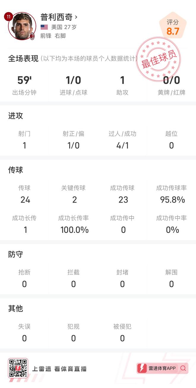 雷速体育9月29日讯 意甲第5轮,AC米兰2-1那不勒斯。此役,米兰前锋普利西奇传射建功,帮助红黑军团取胜。普利西奇全场数据:出场时间:59分钟进球:1个助攻:1个射门:1次过人:4次,成功1次传球:24次,关键传球:2次,成功传球率:95.8%