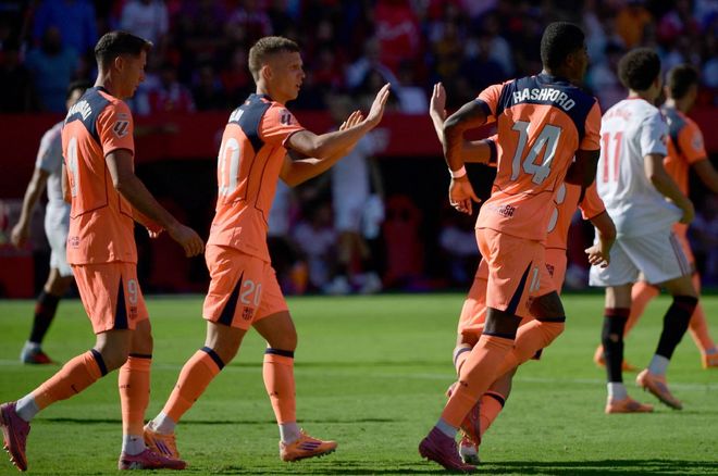 塞维利亚4:1巴萨上周的欧冠,巴萨被大巴黎绝杀尝到了赛季首败,回到西甲赛场,巴萨不仅未能重返正轨,反而继续吃到败仗。开场第13分钟,阿劳霍便在禁区内撞倒了罗梅罗,从而让对手获得点球机会;36岁的桑切斯面对老东家主罚命中,巴萨早早落后。第37分钟,巴尔加斯左路助攻罗梅罗包抄推射扩大优势;拉什福德半场结束前接到佩德里的传中凌空斩打进个人西甲首球。