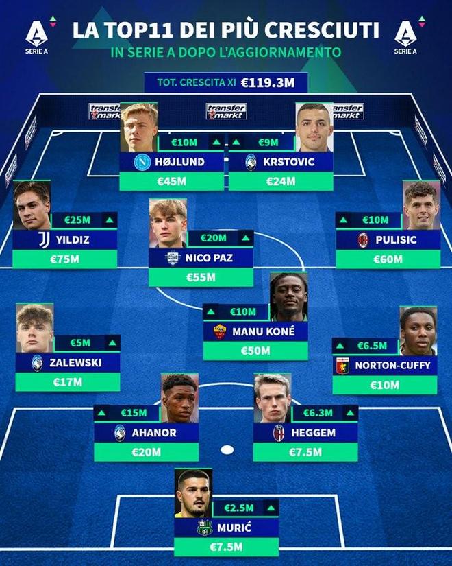 德转更新后意甲身价涨幅最佳11人阵容:门将穆里奇(萨索洛)750万欧元(+250万欧元)后卫诺顿-库菲(热那亚)1000万欧元(+650万欧元)、黑格姆(博洛尼亚)750万欧元(+630万欧元)、阿哈诺尔(亚特兰大)2000万欧元(+1500万欧元)、扎莱夫斯基(亚特兰大)1700万欧元(+500万欧元)中场普利希奇(AC米兰)6000万欧元(+1000万欧元)、夸迪奥-科内(罗马)5000万欧元(+1000万欧元)、尼科-帕斯(科莫)5500万欧元(+2000万欧元)、凯南-伊尔迪兹(尤文图斯)7500万欧元(+2500万欧元)前锋尼古拉-克尔斯托维奇(亚特兰大)2400万欧元(+900万欧元)、霍伊伦(那不勒斯)4500万欧元(+1000万欧元)