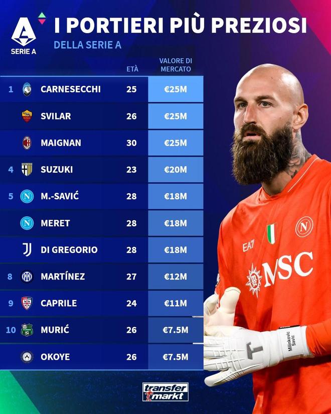 德转更新后意甲门将身价前10:1. 卡尔内塞基(亚特兰大) 2500万欧元1. 斯维拉尔(罗马) 2500万欧元1. 迈尼昂(AC米兰) 2500万欧元4. 铃木彩艳(帕尔马) 2000万欧元5. 瓦尼亚-米林科维奇-萨维奇(那不勒斯) 1800万欧元5. 梅雷特(那不勒斯) 1800万欧元5. 迪格雷戈里奥(尤文图斯) 1800万欧元8. 何塞普-马丁内斯(国际米兰) 1200万欧元9. 卡普里莱(卡利亚里) 1100万欧元10. 穆里奇(萨索洛) 750万欧元10. 奥科耶(乌迪内斯) 750万欧元