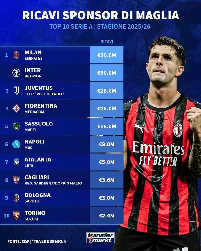 德转统计本赛季意甲俱乐部球衣胸前广告年赞助费TOP10:1. AC米兰 阿联酋航空 3000万欧元1. 国际米兰 Betsson 3000万欧元3. 尤文图斯 Jeep/底特律旅游局 2800万欧元4. 佛罗伦萨 MediaCom 2500万欧元5. 萨索洛 Mapei 1800万欧元6. 那不勒斯 MSC 900万欧元7. 亚特兰大 Lete 500万欧元8. 卡利亚里 Reg. Sardegna/Doppio Malto9. 博洛尼亚 Saputo 300万欧元10. 都灵 铃木 240万欧元