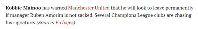 然而,阿莫林的343阵型里,找不到梅诺的合适位置,尤其是队长布鲁诺·费尔南德斯后撤踢中场的话,红魔新帝星就不可能首发,因为他与B费的中场中路组合,必定带来灾难性的结果。阿莫林要求曼联球员,尤其是中场球员充满侵略性,这不是梅诺的特点。据称梅诺是对这名40岁的葡萄牙少帅最为不满的球员之一。他认为因为教练的执教战术和风格,他的角色被边缘化,无法发挥自己的潜力。最终,曼联管理层将不得不在青训新帝星和主教练之间做出选择。为了入选明年夏季世界杯的英格兰队大名单,梅诺夏窗曾要求出租,以便更经常地参加比赛,但曼联拒绝了这一要求,并告知他要为自己的位置而战。但现在梅诺发现,B费无论如何都会首发,他只能在垃圾时间踢个十来二十分钟,他自然不会满意。
