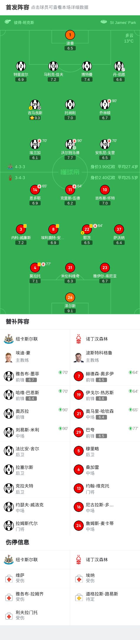 纽卡20诺丁汉森林,吉马良斯世界波,沃尔特马德点射+中楣