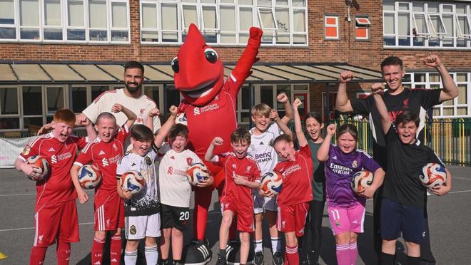 雷速体育10月10日讯 近日,利物浦球队的两名守门员马马尔达什维利和伍德曼与俱乐部吉祥物Mighty Red一同参与了柯比圣劳伦斯小学参加课后足球活动的孩子们的训练。该活动是