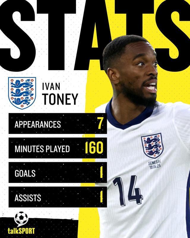伊万-托尼在英格兰队的情况凭借在布伦特福德的出色表现,托尼在2022年9月首次获得英格兰队征召。但他直到次年3月才迎来国际比赛首秀,在一场2-0战胜乌克兰的2024年欧洲杯预选赛中登场。托尼共7次代表英格兰出战,首发1次。他也是三狮军团在2024年欧洲杯决赛对阵西班牙的一员,当时他在比赛末段替补登场。托尼迄今在图赫尔麾下仅有一次出场记录。那是今年夏天的一场友谊赛,英格兰1-3不敌塞内加尔。但他并未入选最新一期国家队大名单。【上咪咕独家看