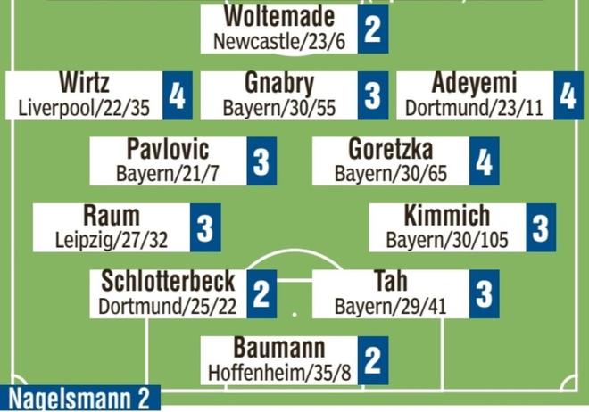 赛后《图片报》对德国全队的表现进行了评分,沃尔特马德、施洛特贝克以及奥利弗-鲍曼获评最高分。德国客战北爱尔兰全队评分(1分最高,6分最低):首发奥利弗-鲍曼(2分);基米希(3分)、约纳坦-塔(3分)、施洛特贝克(2分)、劳姆(3分);格雷茨卡(4分)、亚历山大-帕夫洛维奇(3分);阿德耶米(4分)、格纳布里(3分)、维尔茨(4分);沃尔特马德(2分)替补拜尔(3分)、安德里希(无评分)、安东(无评分)、伯卡特(无评分)、巴库(无评分)主教练纳格尔斯曼(2分)【上咪咕独家看