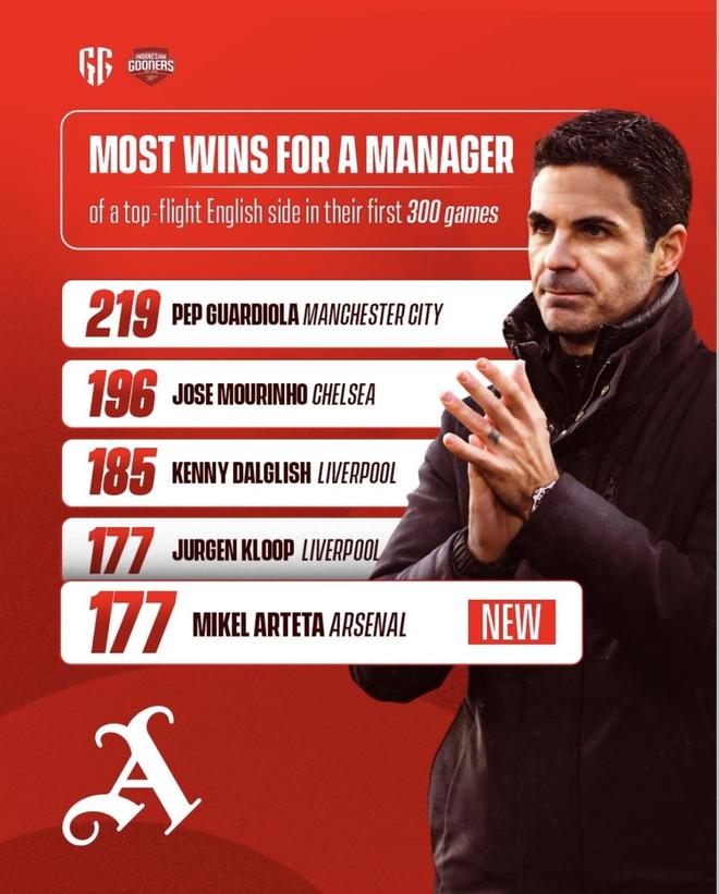 5️⃣ 177 场胜利(新上榜) | 胜率 59.0%米克尔·阿尔特塔俱乐部:阿森纳