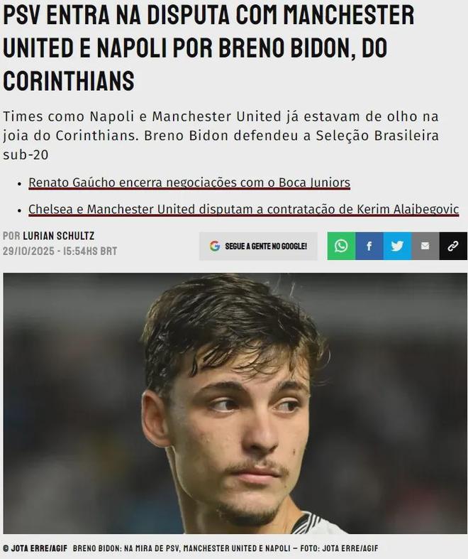 Somos Fanaticos消息,曼联有意收购巴西中场布雷诺-比顿(Breno Bidon),这名20岁的新星还吸引了埃因霍温和那不勒斯的兴趣。报道称,比顿的估价在1200万欧元,阿森纳和热刺也被认为对科林蒂安新星很感兴趣,枪手一年前还曾尝试签下他。另一方面,曼联正着手打造一支年轻有潜力的阵容,而中场位置正是他们明年优先加强的地方。