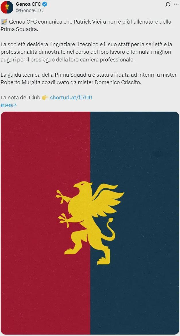 官方:热那亚宣布解雇了主帅维埃拉。本赛季热那亚在9场意甲比赛中未尝一胜,只取得了3平6负的战绩。