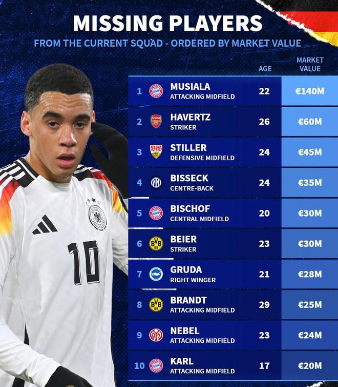 此次未入选德国队大名单身价前10球员:1. 穆西亚拉(拜仁慕尼黑) 1.4亿欧元2. 哈弗茨(阿森纳) 6000万欧元3. 施蒂勒(斯图加特) 4500万欧元4. 比塞克(国际米兰) 3500万欧元5. 比朔夫(拜仁慕尼黑) 3000万欧元6. 拜尔(多特蒙德) 3000万欧元7. 格鲁达(布莱顿) 2800万欧元8. 布兰特(多特蒙德) 2500万欧元9. 内贝尔(美因茨) 2400万欧元10. 伦纳特-卡尔(拜仁慕尼黑) 2000万欧元【上咪咕独家看英超】