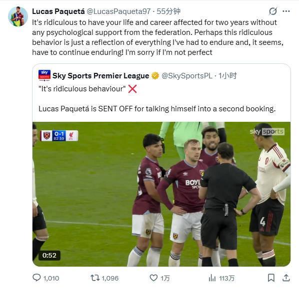 比赛结束后不久,帕奎塔在社交媒体上转发了自己染红的视频,并配文:“生活和事业受到影响长达两年,却得不到足协的任何心理支持,这实在是荒谬。”“或许这种荒谬的行为仅仅是我所不得不忍受的一切的一个缩影,而且似乎我还得继续忍受下去!如果我不够完美,我很抱歉。”“我明白现在我可能看起来像个反派,在生活和心理上承受这一切是很困难的!我会继续努力不让他们对我产生更大的影响,这并不能为我的被罚下场辩护,因此我向球迷和我的队友们道歉!”此前,帕奎塔因涉嫌操纵比赛而被指控,后来,独立监管委员会认定这些指控不成立。然而,他被判犯有两项违反英足总规定的罪行,因为他未能遵守回答问题和向调查部门提供信息的要求。但由于两项违规行为均被证实,帕奎塔最终免于巨额罚款,英足总证实,帕奎塔因其未来的行为受到了训诫和警告,他没有被罚款,但必须支付监管委员会费用的10%,其余部分将由英足总支付。【上咪咕独家看英超】