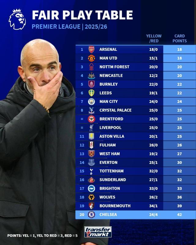 【14】双方本场总计7黄牌1红牌(切尔西1黄1红,阿森纳6黄),其中5黄1红出现在上半场(上半场两队吃牌6张,射门7次)。英超单场红黄牌纪录是去年9月伯恩茅斯vs切尔西一役创下的,共计14张(都是黄牌),是役主裁判也是安东尼·泰勒。【3】2006-07赛季有相关统计以来,阿森纳在英超比赛中,首度开场30分钟内就有3人吃牌。【2】上半场,阿森纳在对方禁区只有2次触球,创2021年12月以来在英超的最低值。【100%】过去3场比赛,廷伯赢下了每一次头球争抢:对热刺3/3、对拜仁3/3、对切尔西5/5。【11/12】里斯·詹姆斯本场数据:12次对抗11次成功、6次传球进入进攻三区、4次被犯规、4次传中、2次创造机会、2次夺回球权、1次助攻、0次犯规。本赛季,詹姆斯各项赛事4次助攻,为队内之最。【20】里斯·詹姆斯在英超已有20次助攻,超越了切尔西边卫前辈阿什利·科尔的19次。【5】本季各项赛事,里斯·詹姆斯已贡献1球4助攻,成为切尔西第7名参与进球达到5+次的球员:若昂·佩德罗7次、恩佐7次、埃斯特旺6次、内托6次、吉滕斯5次、凯塞多5次。【6】生涯迄今,萨卡在英超对阵六强球队参与进球(进球+助攻)数量:对热刺6球、对切尔西6球、对曼联5球、对利物浦4球、对曼城3球。最近7次英超出战切尔西,萨卡有5场参与进球(1球4助攻)。【365】萨卡上次在英超奉上助攻,是在整整1年前,2024年11月30日对阵西汉姆联时。【5】2025年,梅里诺是阿森纳在联赛中的并列头号射手,共打入8球。这当中,5球为头球,在整个英超与布伦特福德前锋沙德并列最多。【70%】梅里诺在英超一共10次破门,其中7球为头球。在英超历史上进球10+的非后卫球员中,只有斯考克罗夫特(本世纪初效力于伊普斯维奇和莱斯特城的英格兰前锋)的头球占比更高(14球包含10个头球,71%)。【1】在21岁152天的年纪,加纳乔成为英超历史上完成100次出场的最年轻南美球员,打破了马丁内利保持的纪录。【162】最近162场英超,阿森纳第2次同时缺少加布里埃尔和萨利巴。切尔西阵容(4231):罗伯特·桑切斯/古斯托、韦斯利·福法纳、特雷沃·查洛巴、库库雷利亚/里斯·詹姆斯、凯塞多/埃斯特旺(46’加纳乔)、恩佐、佩德罗·内托/若昂·佩德罗(55’德拉普)阿森纳阵容(433):拉亚/廷伯、莫斯克拉、因卡皮耶、卡拉菲奥里(46’刘易斯-斯凯利)/埃泽(72’哲凯赖什)、苏维门迪(57’厄德高)、赖斯/萨卡、梅里诺、马丁内利(57’马杜埃凯)