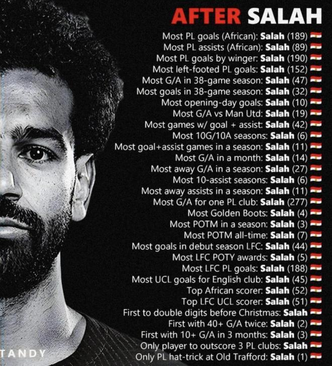 单赛季(38轮)进球最多萨拉赫 | Mohamed Salah国籍:埃及新记录:32英超揭幕战进球最多萨拉赫 | Mohamed Salah国籍:埃及新记录:10对阵曼联进球+助攻最多萨拉赫 | Mohamed Salah国籍:埃及新记录:19单场同时进球+助攻的比赛场次最多萨拉赫 | Mohamed Salah国籍:埃及新记录:42单赛季至少10球+10助攻的赛季次数最多萨拉赫 | Mohamed Salah国籍:埃及新记录:6单赛季“进球+助攻”的比赛场次最多萨拉赫 | Mohamed Salah国籍:埃及新记录:11单月进球+助攻最多萨拉赫 | Mohamed Salah国籍:埃及新记录:14单赛季客场进球+助攻最多萨拉赫 | Mohamed Salah国籍:埃及新记录:27英超单赛季助攻上双次数最多萨拉赫 | Mohamed Salah国籍:埃及新记录:6英超单赛季客场助攻最多萨拉赫 | Mohamed Salah国籍:埃及新记录:11为同一家英超俱乐部贡献进球+助攻最多萨拉赫 | Mohamed Salah国籍:埃及新记录:277英超金靴次数最多萨拉赫 | Mohamed Salah国籍:埃及新记录:4单赛季英超月度最佳球员次数最多萨拉赫 | Mohamed Salah国籍:埃及新记录:3英超历史月度最佳球员次数最多萨拉赫 | Mohamed Salah国籍:埃及新记录:7利物浦球员处子赛季进球最多萨拉赫 | Mohamed Salah国籍:埃及新记录:44利物浦队内年度最佳球员次数最多萨拉赫 | Mohamed Salah国籍:埃及新记录:5利物浦英超进球最多萨拉赫 | Mohamed Salah国籍:埃及新记录:188英格兰俱乐部欧冠进球最多萨拉赫 | Mohamed Salah国籍:埃及新记录:45非洲球员英超总进球最多萨拉赫 | Mohamed Salah国籍:埃及新记录:52利物浦队史欧冠进球最多萨拉赫 | Mohamed Salah国籍:埃及新记录:51圣诞节前联赛进球上双的第一人萨拉赫 | Mohamed Salah国籍:埃及新记录:1两次单赛季40+进球+助攻的第一人萨拉赫 | Mohamed Salah国籍:埃及新记录:2连续3个月单月10+进球+助攻的第一人萨拉赫 | Mohamed Salah国籍:埃及新记录:3唯一一位英超进球数超过3支英超俱乐部总进球的球员萨拉赫 | Mohamed Salah国籍:埃及新记录:1唯一一位在老特拉福德上演英超帽子戏法的球员萨拉赫 | Mohamed Salah国籍:埃及新记录:1