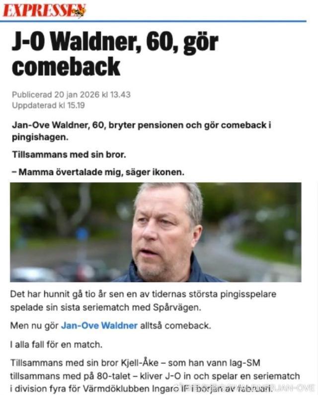 1月21报道 60岁的瑞典乒乓球名将瓦尔德内尔宣布,自己将复出回到赛场,他将参加瑞典丁级联赛(第四级别)英加略对阵布奥的比赛,代表英加略俱乐部出战。谈到本次复出的原因,瓦尔德内尔写道:妈妈想再看到我们兄弟俩一起打球,我们兄弟俩都很愉快地同意了。被问到是否还能征战瑞典乒乓球顶级联赛,老瓦回答:“顶级联赛的难度大多了,球速快、节奏紧,不仅需要出色的体能,还得打大量的比赛保持状态。如果要打顶级联赛,我得先减掉六七公斤体重,把体能练上去才行,但我现在实在吃不消这些。”