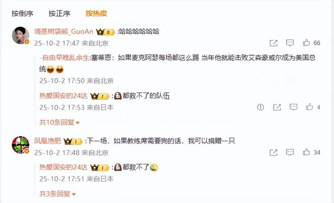 国安官微下也遭到了自己家球迷的反戈一击,两大国安著名球迷均发表了言论,“清蒸树袋熊”打了一串哈哈哈哈哈哈来发泄情绪,“凤凰鱼肥”则表示下一场,如果教练席需要狗的话,我可以捐赠一只。