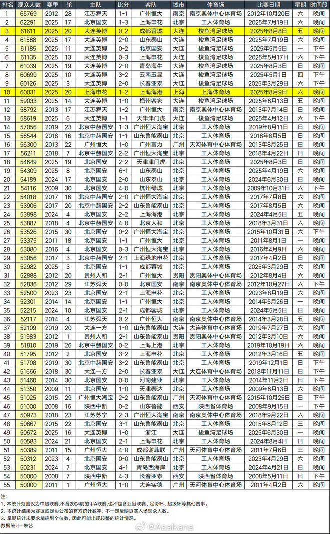 雷速体育10月4日讯 2025中超联赛第23轮补赛,大连英博坐镇主场迎战青岛西海岸,本场比赛的上座人数为61616人,这一人数也创下了梭鱼湾足球场上座人数的历史新高,排在中超历史第三位。目前中超历史上座人数排行榜