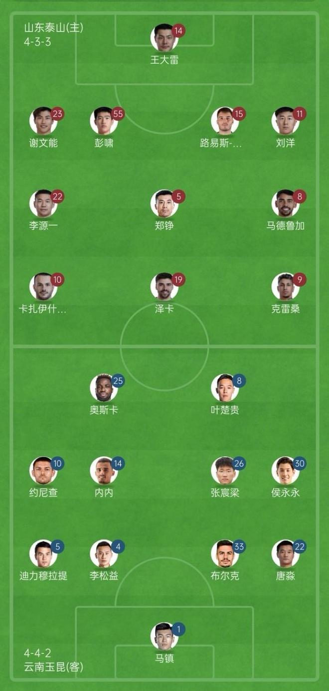 10月4日晚,山东泰山将在主场迎战云南玉昆,目前双方首发阵容已经出炉,让球迷感到意外的是泽卡伤愈复出,他将与瓦科、克雷桑重新组成“三叉戟”在前场冲锋陷阵。山东泰山首发:14-王大雷、5-郑铮、11-刘洋、15-路易斯-洛佩斯(F)、55-彭啸、8-马德鲁加(F)、22-李源一、9-克雷桑(F)、10-卡扎伊什维利(F)、19-泽卡(F)、23-谢文能山东泰山替补:32-孙启航、51-刘琪玮、17-吴兴涵、21-刘彬彬、29-陈蒲、31-赵剑非、35-黄政宇、38-李小恒、44-史松宸、57-王昊斌、58-彭逸翔、61-齐千程云南玉昆首发:1-马镇、4-李松益、5-迪力穆拉提、22-唐淼、26-张宸梁、33-布尔克(F)、8-叶楚贵、10-约尼查(F)、14-内内(F)、30-侯永永、25-奥斯卡(F)云南玉昆替补:13-邱圣均、24-余鉴贤、2-陈宇浩、16-张祥硕、19-段德智、29-杨贺、6-赵宇豪、7-罗竞、17-孙学龙、20-张宇峰、23-尹聪耀、9-佩德罗-恩里克(F)新闻线索报料通道:应用市场下载“齐鲁壹点”APP,或搜索微信小程序“齐鲁壹点”,全省800位记者在线等你来报料!