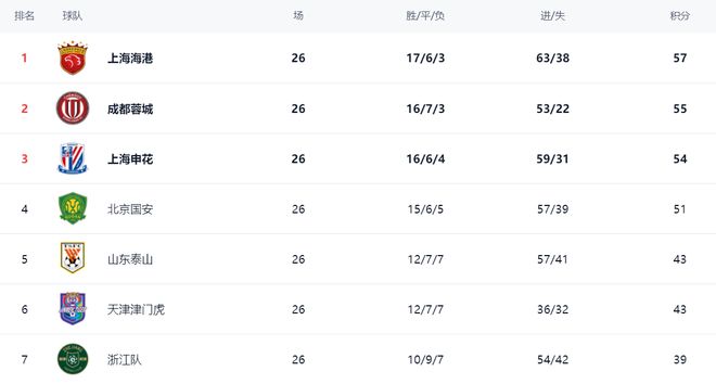 在积分榜上,上海海港以57分高居榜首。排名第2的是成都蓉城,拿到55分,落后2分,依然有夺冠的希望。上海申花54分排名第3。第4的是北京国安,拿到51分,落后榜首6分,争冠希望渺茫。而山东泰山拿到平局之后,总积分是43分,升到第5名。天津津门虎也是43分,排名第6。第7的浙江队拿到39分。