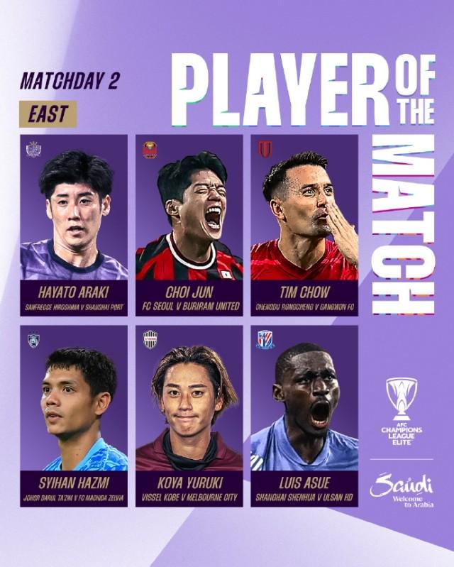 周定洋、阿苏埃入选亚冠最佳球员中国足球 10-15 11:38亚足联官方公布亚冠精英联赛第2比赛日的最佳球员。周定洋凭借成都蓉城比赛中一粒至关重要的进球入选;上海申花外援阿苏埃建功入选。