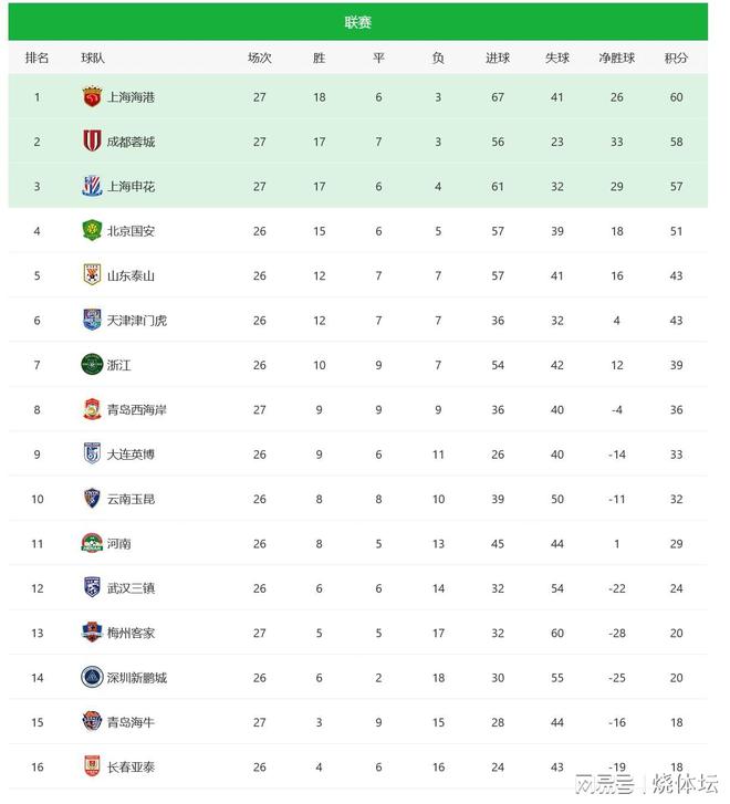 成都蓉城 3-1 梅州客家此役成都蓉城坐镇五粮液文化体育中心足球场,第18分钟杨明洋破门1-0领先,可是第25分钟就被罗德里格进球扳平比分。此后,第70分钟莱切特建功,第82分钟罗慕洛破门,成都蓉城下半场连进2球保住3分。成都蓉城主场全取3分,总积分提升到58分,与榜首上海海港还是2分差距。梅州客家未能带走积分,球队综合形势比较复杂,保级压力依然巨大。 青岛西海岸 1-2 上海申花此役青岛西海岸坐镇青岛西海岸大学城体育场,第13分钟派恩斯进球取得领先,第20分钟吴曦点球打进助上海申花扳平比分。此后,第38分钟孙捷凶狠犯规被红牌罚下,第45分钟张呈栋硬刚甘树然也被染红离场,青岛西海岸不到本场被罚下2人。第58分钟,于汉超头球建功,上海申花反超比分。此役上海申花客场带走3分,由此取得联赛2连胜,总积分提升到57分仍排名第三。青岛西海岸3连胜被终结,前十位置比较稳,本赛季综合表现可圈可点。