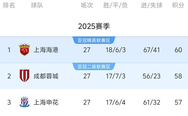 下半场易边再战,第58分钟,申花利用左侧角球机会,于汉超头球攻门得手,申花2-1将比分反超。此后申花未能乘胜追击,尾声阶段杨泽翔禁区射门被门将没收。最终申花2-1逆转9人作战的青岛西海岸,取得2连胜的同时,终结对手的3连胜。最新积分榜方面,由于争冠3队本轮取得全胜,前3的排名没有发生变化。上海海港成为首支突破60分的球队,继续以2分的优势领跑。成都蓉城积58分排在第2,上海申花则积57分位列第3。 3支争冠球队最大分差仍仅有3分,均保留着争冠的可能。最后3轮比赛,上港要先后挑战山东泰山和浙江队,申花则有挑战天津津门虎,成都蓉城剩下的3个对手则没有强队。保级方面,2支率先出战的保级球队均以失利告终,4支保级球队仍仅差2分,海牛18分继续排在倒数第2,梅州客家则积20分排在倒数第4,保级悬念恐怕也要保留到最后时刻。