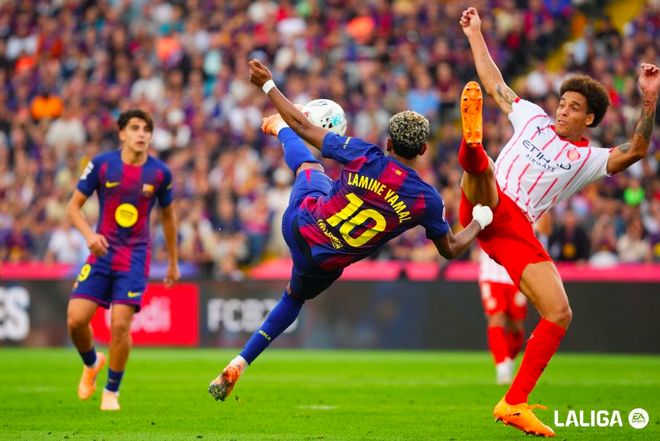 巴萨则是遭遇了中前场严重的伤病危机,从莱万多夫斯基到拉菲尼亚,从费兰再到奥尔莫,巴萨伤病满营。随之而来的代价就是国际比赛日前,巴萨联赛惨败给塞维利亚,欧冠又负于巴黎圣日耳曼。前8轮战罢,卫冕冠军巴萨6胜1平1负,暂时落后领头羊皇马2分。开场之后,巴萨就展现出了强大的优势,控球率一度超过了90%。 第13分钟,孔德杂耍一般过人,亚马尔传球,佩德里横向盘带之间,突然一脚冷射打向反角,巴萨取得领先。第20分钟,场上出现令人瞠目结舌的一幕,36岁的中超旧将维特塞尔腾空而起,倒钩射门,皮球弹地后,什琴斯尼扑救不及。