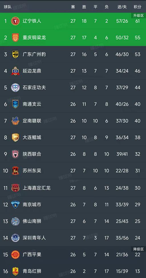 辽宁铁人基本冲超成功目前在中超征战的东北球队有长春亚泰、大连英博,辽宁铁人冲超成功扩大东北足球在中超的版图,球迷可以期待下赛季中超的辽宁德比,当然目前长春亚泰的保级压力非常大,他们要想办法留在中超。 重庆暂列第二重庆铜梁龙和广东广州豹的积分分差只差2分,他们还在争夺另一张冲超门票。本轮重庆铜梁龙凭借向余望的双响,2-1逆转了大连鲲城,换帅之后迎来一波3连胜,积分上涨到55分,继续力压广东广州豹掌握冲超的主动权。最后三轮,重庆铜梁龙的对手分别是石家庄功夫、苏州东吴和上海嘉定汇龙,对阵石家庄和苏州都是主场作战。广东广州豹凭借商隐的唯一进球,1-0小胜苏州东吴,同样迎来三连胜,继续保留冲超悬念,最后三轮的对手分别是陕西联合、青岛红狮和南通支云!