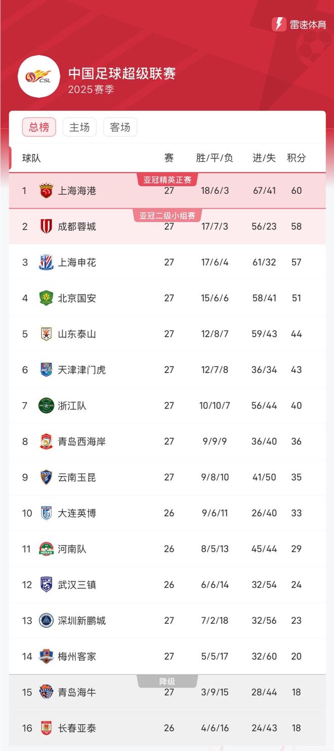 雷速体育10月18日讯 中超第27轮今天继续进行,北京国安客场1-2不敌深圳新鹏城,泰山2-2战平积分榜。在最新的积分榜中,上海海港积60分排在榜首,领先成都蓉城2分,申花排在第三位,北京国安落后榜首9分,基本无缘争冠。中超最新积分榜