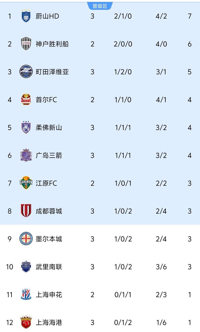 蔚山HD则坐镇主场迎战广岛三箭。上半场开场仅12分钟,李镇贤助攻金珉赫头球首开记录,帮助主队1-0领先。第34分钟,广岛三箭球员禁区劲射击中横梁弹出,上半场蔚山HD1-0领先。下半场易边再战,广岛三箭多次错失扳平机会,双方下半场均无建树,最终蔚山HD以1-0的比分力克对手,新赛季亚冠3轮保持不败。 最新积分榜方面,2支中超球队输球之后排名再次下跌。上港成为本赛季首支3轮不胜的球队,在墨尔本城拿到首胜之后成为新的垫底球队。成都蓉城与墨尔本城、武里南联同积3分,凭借净胜球优势暂时排在第8。2支3轮保持不败的球队,蔚山HD积7分,在先赛一场的情况下暂时登顶积分榜;町田泽维亚则积5分跃升至第3。另外还有2支球队有望拿到3轮不败,其中首尔FC将会在第二个比赛日客场挑战中超球队上海申花。此前的2轮比赛中申花同样未能拿到首胜,和上港成为仅有的2支没有拿到首胜的球队。此番主场作战,遇到中超联赛争冠关键期,恐怕难以以全主力力拼首胜。