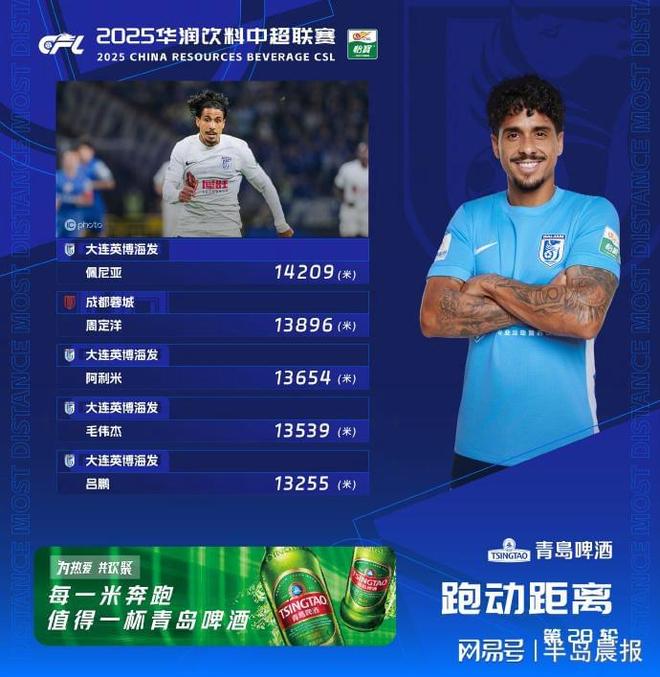 (@CSL中超联赛) 27日晚间,中超第28轮跑动榜公布,大连英博4名球员跻身前五,这也从另一个角度诠释了他们在与申花一战中的优秀表现。本赛季迄今为止,英博先后在7轮比赛中有球员跻身这一榜单的前五名,这次是上榜人数最多的一次。 首轮联赛中,英博客场战平浙江队,吕鹏、阿利米分列该轮中超跑动榜前两名,拉布亚德排在第五位。那是英博队史上的首场中超比赛,全队在客场表现让人眼前一亮,最终也顺利拿到了第一个中超积分。第2轮、第3轮联赛中,阿利米连续登上跑动榜,分别排在第一和第三位。此外,他还在第18轮、第22轮联赛中进入榜单前五名,是英博队中进入跑动榜次数最多的球员。 本轮联赛中,阿利米第六次上榜,以13654米的跑动距离排在第三位。领跑的是队友佩尼亚,跑动距离高达14209米,不仅刷新了本赛季跑动榜最长距离纪录,也是本赛季球员单场跑动距离首次突破14000米大关。毛伟杰、吕鹏分列四、五位,跑动距离分别为13539米和13255米。客场挑战整体实力更强的申花,英博能够在比赛的多数时间内处于领先,与球员们不知疲倦的跑动有着直接关系。 本期跑动榜前五名差点被英博包揽,但成都蓉城的周定洋仍强有力地抢占了次席。他毫无疑问是本赛季中超最能跑的球员,截至目前,已经在14轮联赛中占据跑动榜首位,先后21次跻身榜单前五名。半岛晨报、39度视频记者隋海涛