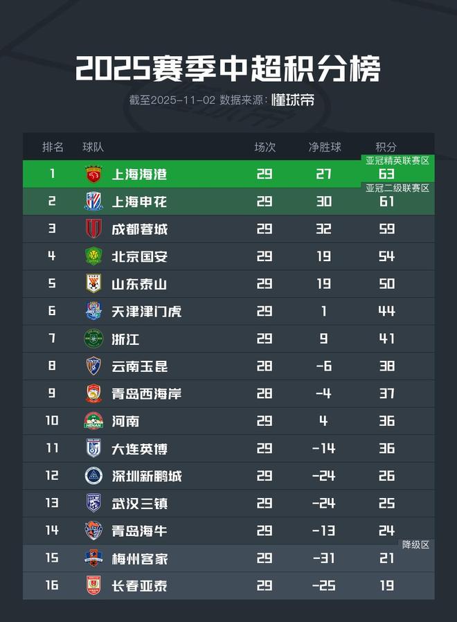 在本轮先进行的两场比赛中,亚泰和梅州均未取胜,因此目前在仅剩最后一轮的情况下,青岛海牛积24分,领先梅州客家3分。