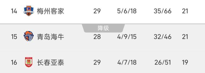 雷速体育11月1日讯 北京时间今日,中超第29轮多轮比赛落下帷幕,其中长春亚泰主场0-4不敌国安,梅州客家主场2-2战平大连英博。中超保级形势仍然扑朔迷离。目前长春亚泰完赛29轮积19分垫底,梅州客家完赛29轮积21分排名倒三、因胜负关系暂离降级区,而青岛海牛完赛28轮积21分暂列倒二。