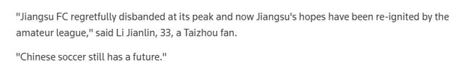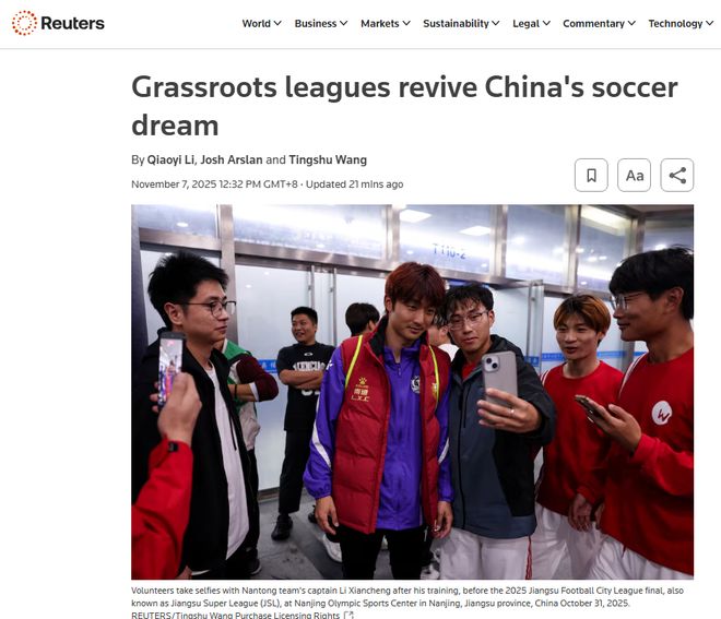 路透社7日的一篇报道指出,在中国农村,由农民、学生和工厂工人自发组织的业余足球联赛意外吸引了数百万观众,并激励大城市效仿。这燃起了中国通过“草根培育”培养人才、最终跻身足球强国的希望。路透社网站报道截图  报道说,拥有14亿多人口的中国约有2亿足球粉丝,数量居全球之首,却始终未能打造世界级球队。但2023年,被称为“村超”的乡村足球联赛成功翻开了中国足球历史的一页。这项赛事凭借激情对决、中场民俗表演和以家禽牲畜作为奖品的特色,俘获了大批球迷观众,带动当地旅游经济。  报道注意到,“村超”的热潮推动大城市尝试复制其成功模式。11月1日,由江苏省体育局和13个地市政府联合举办的“江苏城市足球联赛”决赛在南京奥体中心体育场举行,吸引了62329名现场观众,逼近2012年职业联赛65769人的纪录。另有200万未能抢到20元低价票的观众在线观看了决赛。整个“苏超”赛季85场比赛的线上观看量突破22亿次。路透社网站报道截图  路透社采访了一位来自泰州的球迷,他曾犹豫是否让儿子走足球道路,但14岁的儿子在7月观看泰州队战胜镇江队后坚定了踢球的决心。  报道指出,“苏超”的成功已引发中国多省效仿:辽宁去年推出联赛,河北和内蒙古8月成立联赛,湖南和四川则在9月开赛。  报道认为,业余联赛也正在初步打通中国足球职业化的通道。18岁的泰州队中场武之程,今年7月成为首位跻身中国顶级职业联赛——中超的球员。  报道称,南京奥体中心曾是江苏队的主场,这支球队曾聘请前英格兰主教练卡佩罗执教,球队于2020年夺得中超冠军,后因资金困局在巅峰期解散。“江苏队遗憾落幕,但如今江苏的希望被业余联赛重新点燃”,一位球迷说,“中国足球还有未来”。路透社网站报道截图  来源 | 总台环球资讯  编译 | 李琳  签审 | 王昆鹏  监制 | 蔡耀远