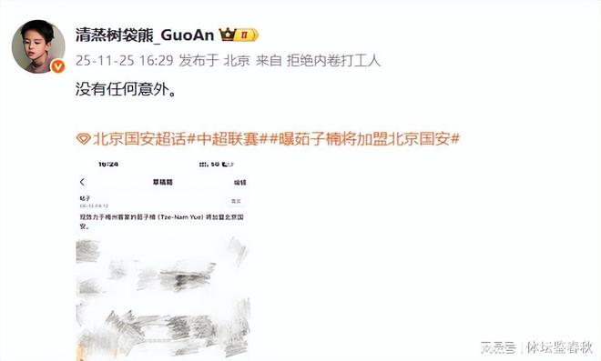 近日,一位资深北京足球博主在社交媒体上发文称,北京国安已经正式敲定签下梅州客家主力右边卫茹子楠,这位27岁的中国香港国脚将在下个赛季身披国安战袍征战中超联赛。此前,有不少媒体爆料上海海港将引进茹子楠,但国安还是最终胜出。2022年夏天,茹子楠从香港东方队加盟梅州客家,逐步成长为球队后防中坚。本赛季,茹子楠共代表梅州客家出战了19轮中超联赛,打进3球。他在代表中国香港队参加东亚杯时受伤,因此缺席了7轮中超联赛。