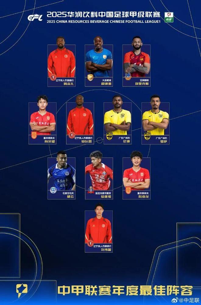 【中乙最佳阵容】前锋:费尔南多(广西恒宸)、凯赛尔·吐尔逊(无锡吴钩)、王博文(海门珂缔缘)中场:同乐(无锡吴钩)、史乐天(北京理工)、张华峻(广西恒宸)后卫:彭啸(山东泰山B队)、张梓健(广西恒宸)、勾俊晨(无锡吴钩)、徐友刚(江西庐山)守门员:胡皓然(长春喜都)