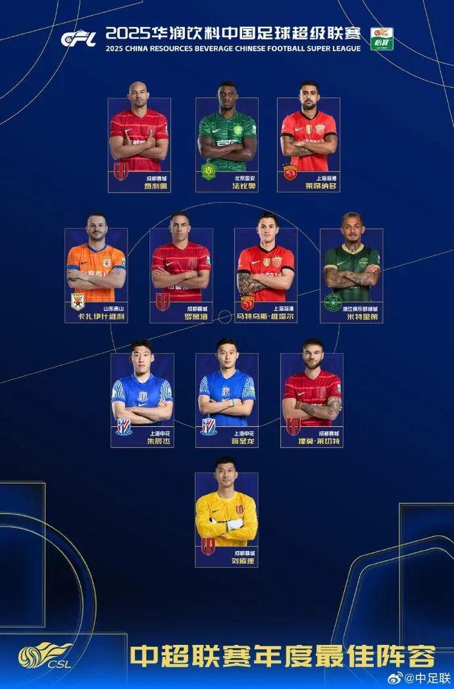 【中超最佳阵容】前锋:法比奥(北京国安)、莱昂纳多(上海海港)、费利佩(成都蓉城)中场:卡扎伊什维利(山东泰山)、米特里策(浙江俱乐部绿城)、罗慕洛(成都蓉城)、马特乌斯·维塔尔(上海海港)后卫:提莫·莱切特(成都蓉城)、蒋圣龙(上海申花)、朱辰杰(上海申花)守门员:刘殿座(成都蓉城)